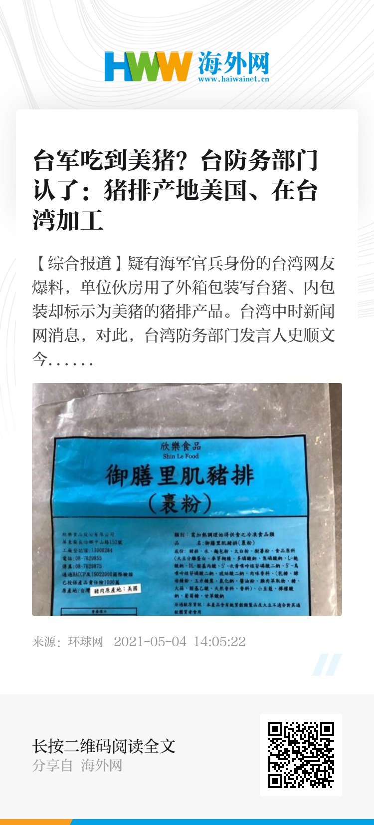【环球网综合报道】疑有海军官兵身份的台湾网友爆料,单位伙房用了外箱包装写台猪、内包装却标示为美猪的猪排产品。台湾中时新闻网消息,对此,台湾防务部门发言人史顺文今天(4日)承认,外箱标示的是制造与加工的地区,也就是台湾,但内包装同时也明确标示猪肉的原产地是美国,他声称此举符合“卫福部”标示规定。