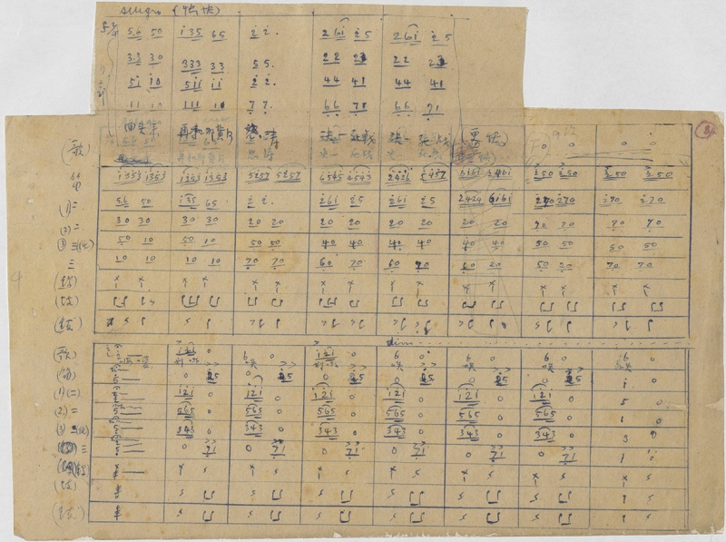 图为延安手稿中,冼星海在写好的曲谱上方贴上一张小条