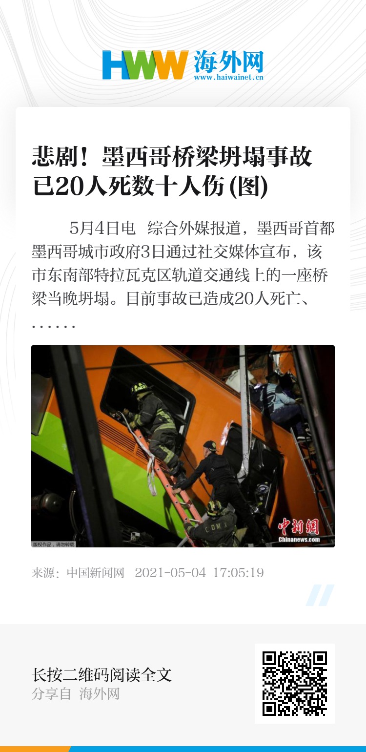 中新网5月4日电 综合外媒报道,墨西哥首都墨西哥城市政府3日通过社交媒体宣布,该市东南部特拉瓦克区轨道交通线上的一座桥梁当晚坍塌。目前事故已造成20人死亡、数十人受伤。