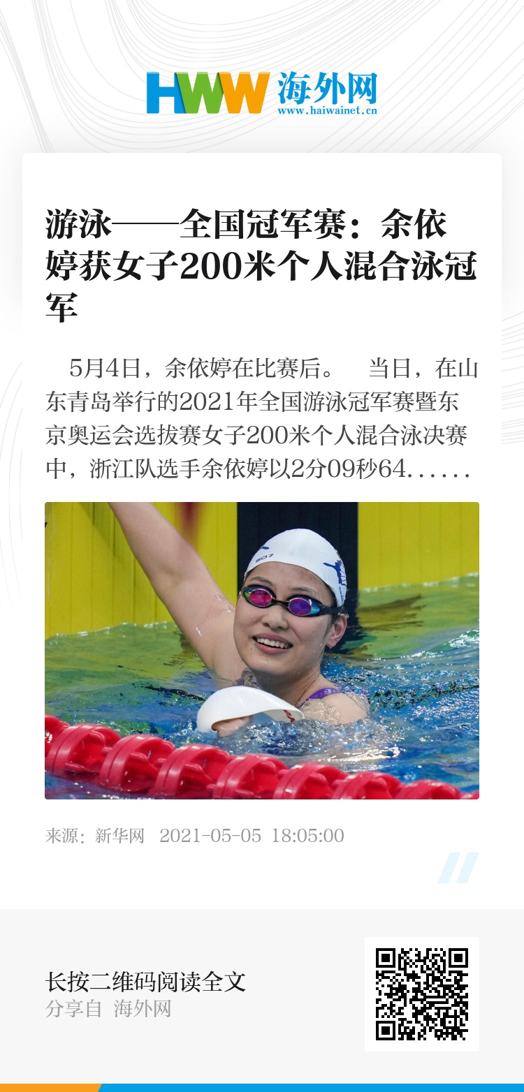 当日,在山东青岛举行的2021年全国游泳冠军赛暨东京奥运会选拔赛女子200米个人混合泳决赛中,浙江队选手余依婷以2分09秒64的成绩获得冠军。