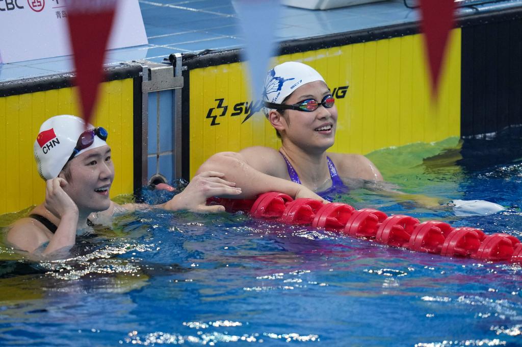 5月4日,余依婷(右)与浙江队选手叶诗文在比赛后。