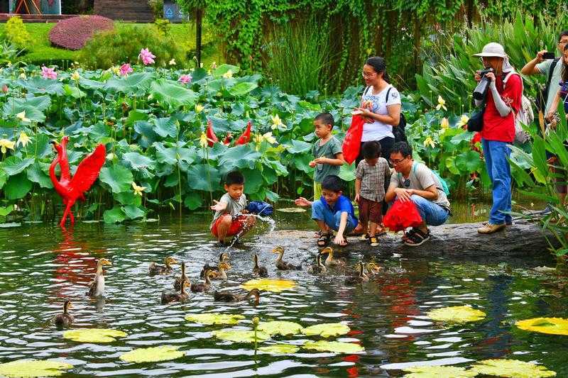 亲子游客在莲花山旅游区与鸭子们互动(来源:广州日报)
