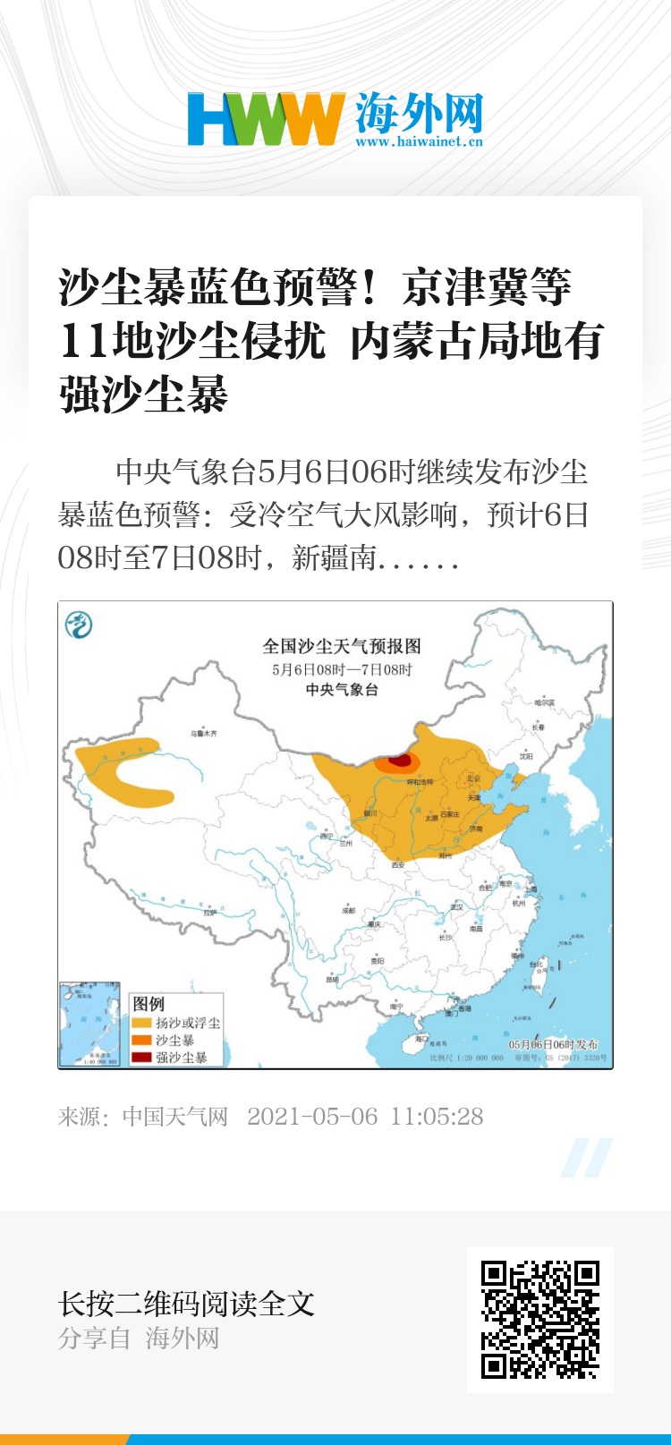 中央气象台5月6日06时继续发布沙尘暴蓝色预警:受冷空气大风影响,预计6日08时至7日08时,新疆南疆盆地西部、内蒙古中西部、宁夏、陕西中北部、山西、河北、北京、天津、山东中北部、河南北部、辽宁南部等地有扬沙或浮尘天气,其中内蒙古中部部分地区有沙尘暴,局地有强沙尘暴。