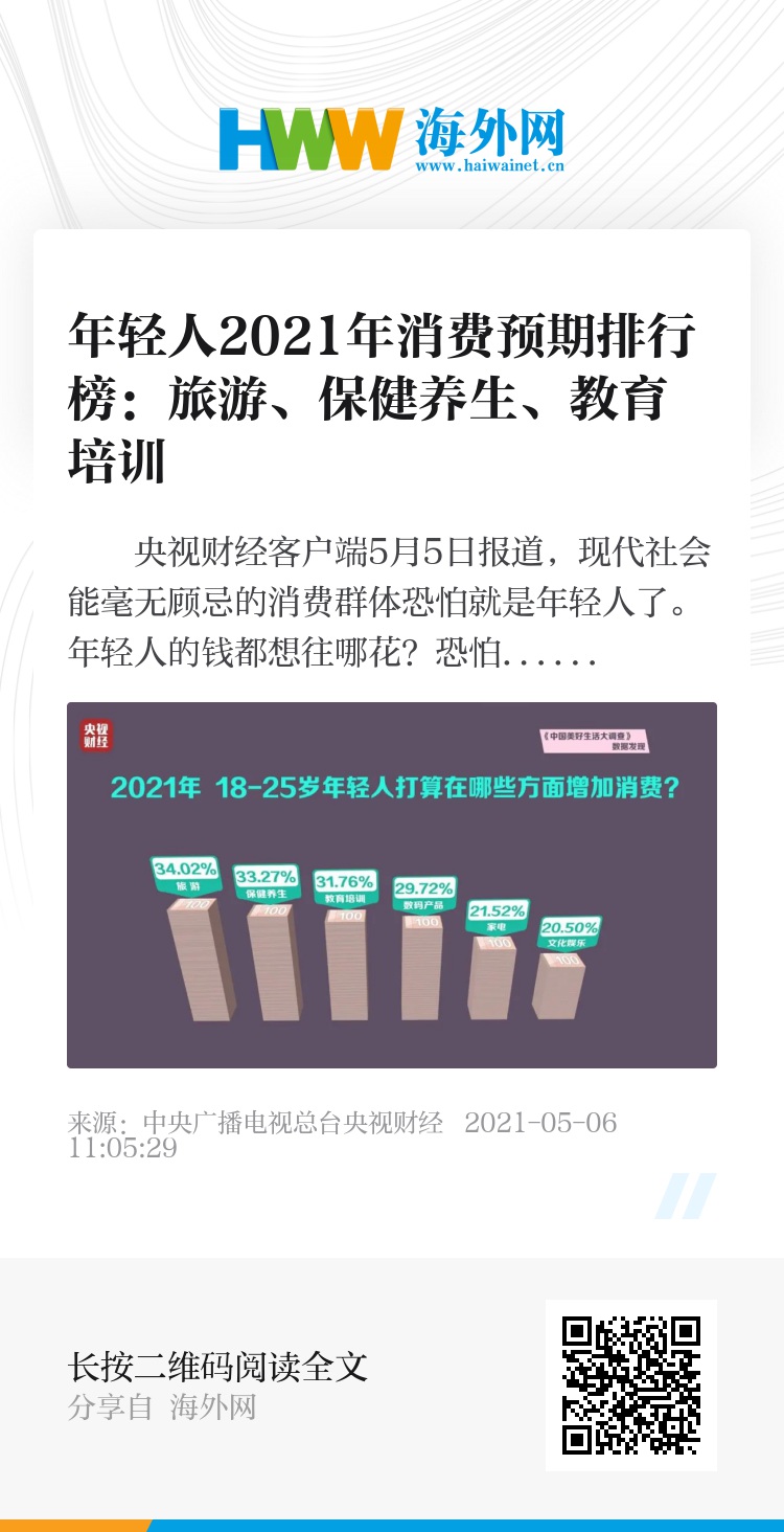 央视财经新媒体联合《中国美好生活大调查》发布中国青年消费大数据。数据显示,在2021年的消费预期中,旅游、保健养生和教育培训位列18-25岁年轻人消费榜单的前三甲。