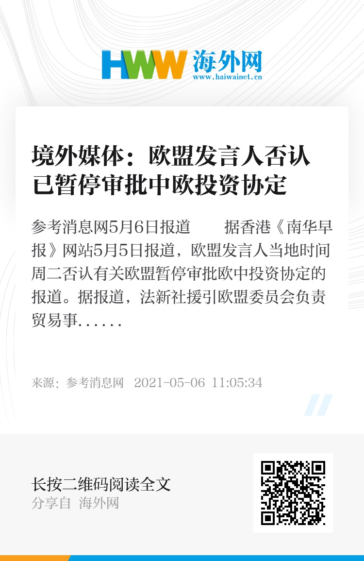参考消息网5月6日报道 据香港《南华早报》网站5月5日报道,欧盟发言人当地时间周二否认有关欧盟暂停审批欧中投资协定的报道。