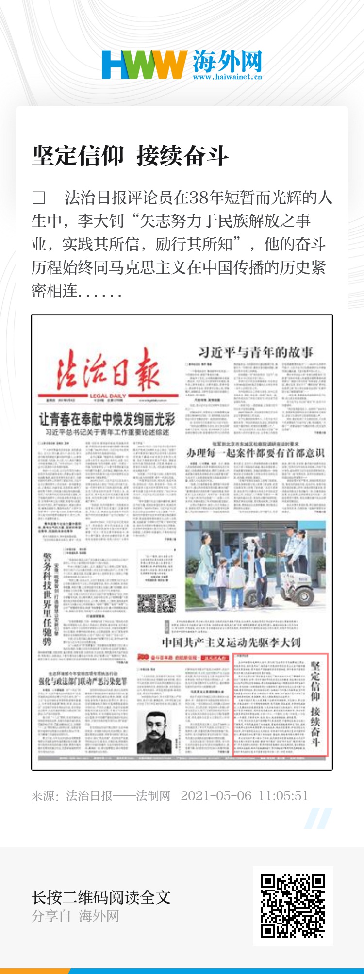 在38年短暂而光辉的人生中,李大钊“矢志努力于民族解放之事业,实践其所信,励行其所知”,他的奋斗历程始终同马克思主义在中国传播的历史紧密相连,同中国共产党创建的历史紧密相连,同中国共产党领导的为中国人民谋幸福的历史紧密相连。