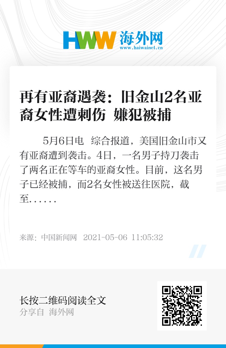 中新网5月6日电 综合报道,美国旧金山市又有亚裔遭到袭击。4日,一名男子持刀袭击了两名正在等车的亚裔女性。目前,这名男子已经被捕,而2名女性被送往医院,截至5日,两人尚未出院。