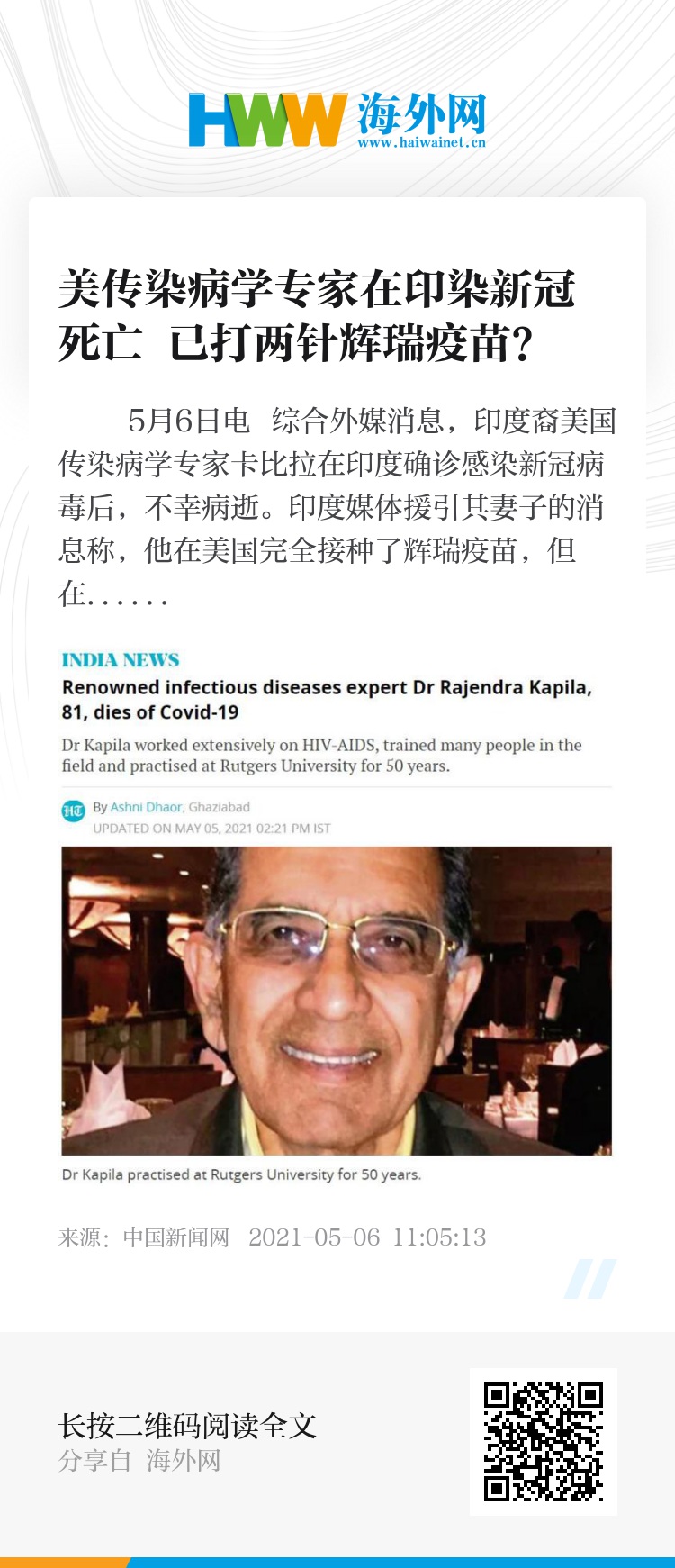 中新网5月6日电 综合外媒消息,印度裔美国传染病学专家卡比拉在印度确诊感染新冠病毒后,不幸病逝。印度媒体援引其妻子的消息称,他在美国完全接种了辉瑞疫苗,但在印度停留2周就感染。