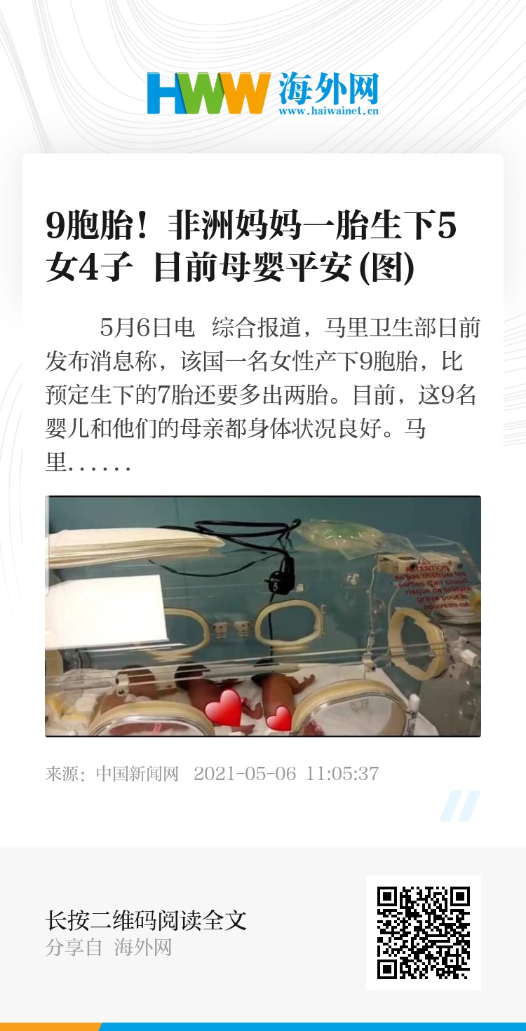 中新网5月6日电 综合报道,马里卫生部日前发布消息称,该国一名女性产下9胞胎,比预定生下的7胎还要多出两胎。目前,这9名婴儿和他们的母亲都身体状况良好。