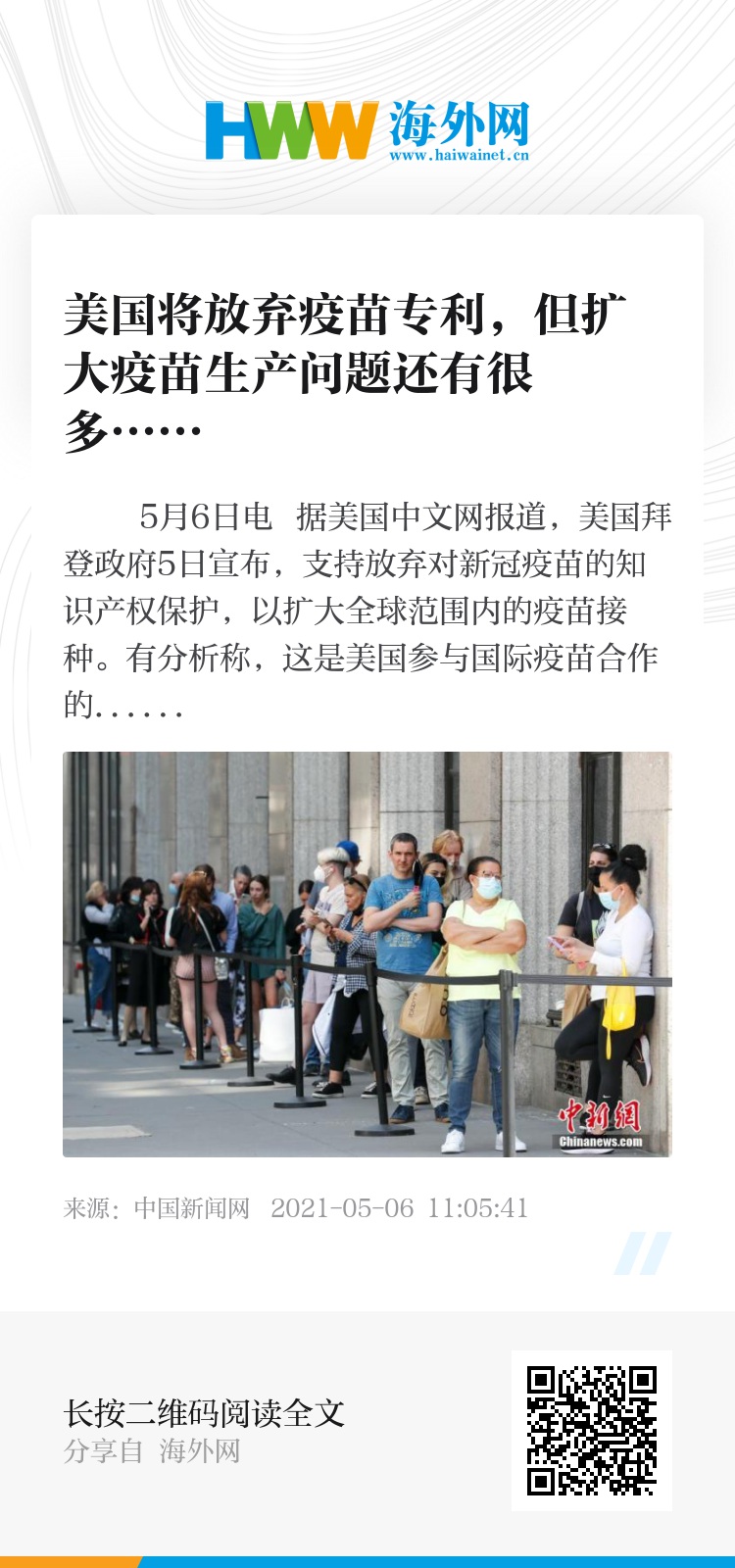 中新网5月6日电 据美国中文网报道,美国拜登政府5日宣布,支持放弃对新冠疫苗的知识产权保护,以扩大全球范围内的疫苗接种。有分析称,这是美国参与国际疫苗合作的一个重要举措。但也有人表示,疫苗专利并非中低收入国家生产更多疫苗的主要障碍;一些人还称,此类协议或损害企业的创新动力。