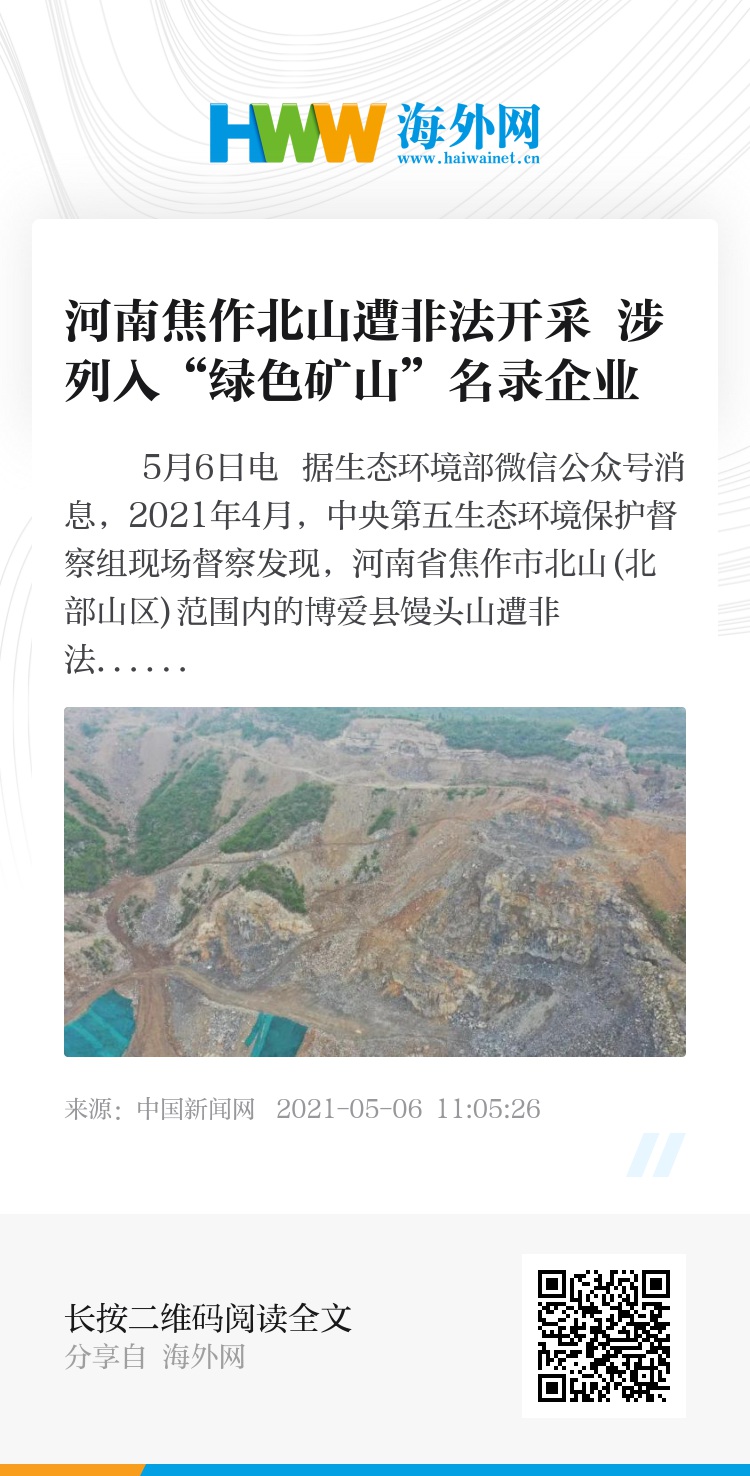 中新网5月6日电 据生态环境部微信公众号消息,2021年4月,中央第五生态环境保护督察组现场督察发现,河南省焦作市北山(北部山区)范围内的博爱县馒头山遭非法开采,破坏山林严重,马村区部分列入“绿色矿山”名录的石材加工企业非法越界开采等问题突出。