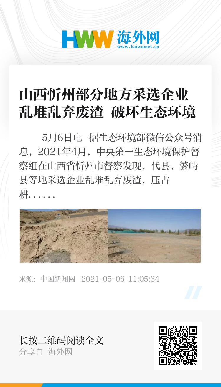 中新网5月6日电 据生态环境部微信公众号消息,2021年4月,中央第一生态环境保护督察组在山西省忻州市督察发现,代县、繁峙县等地采选企业乱堆乱弃废渣,压占耕地林地,侵占自然保护区,污染生态环境,群众反映十分强烈。