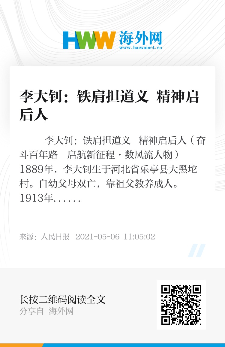“铁肩担道义,妙手著文章”,是李大钊光辉一生的真实写照。李大钊开创的伟大事业和留下的思想遗产永远不可磨灭,他播撒的革命种子已经在中国大地上生根、开花、结果。