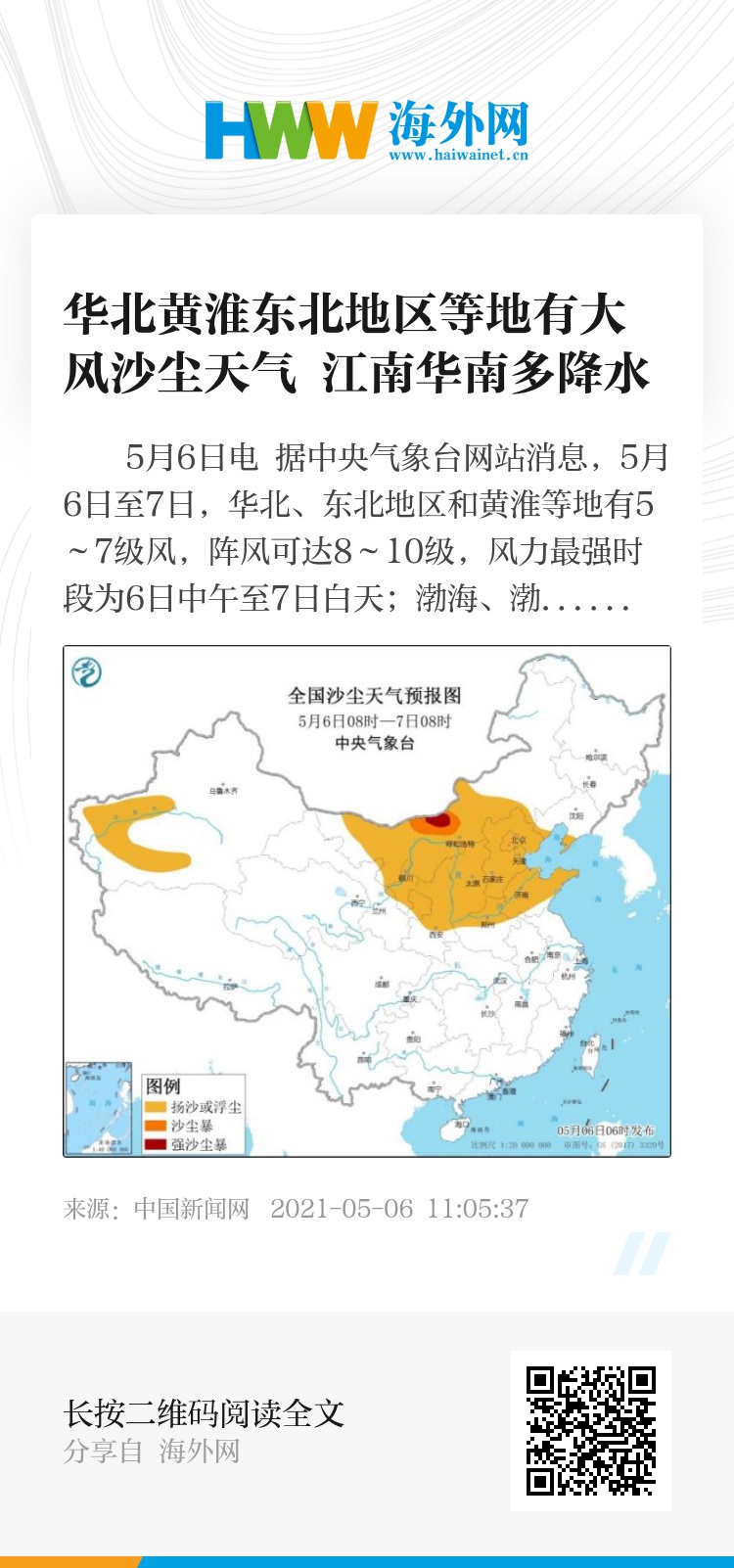 中央气象台5月6日6时继续发布沙尘暴蓝色预警:6日8时至7日8时,新疆南疆盆地西部、内蒙古中西部、宁夏、陕西中北部、山西、河北、北京、天津、山东中北部、河南北部、辽宁南部等地有扬沙或浮尘天气,其中内蒙古中部部分地区有沙尘暴,局地有强沙尘暴。