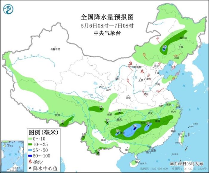 5月6日8时至7日8时,内蒙古中部偏南地区、河北北部、西藏中北部等地的部分地区有小到中雪或雨夹雪;西南地区大部、江南、华南、东北地区大部、内蒙古东部、山东半岛、台湾岛东部等地有小到中雨,其中,内蒙古东部偏南地区、湖南中部、贵州南部等地的部分地区有大雨,局地暴雨(50~60毫米),山东半岛等地局地或伴有雷暴大风等强对流天气。西北地区东部、华北、黄淮、东北地区中南部等地的部分地区有5~7级风。