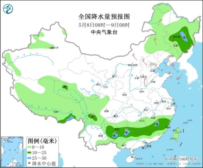 5月8日8时至9日8时,西藏中西部、青海南部等地的部分地区有小到中雪或雨夹雪;江南中南部、华南西部和北部、西南地区北部和东南部以及东北地区大部、内蒙古东部等地有小到中雨,其中,广西北部、福建西部、黑龙江东南部等地的部分地区有大雨(25~40毫米)。东北地区中南部、内蒙古中东部、华北中东部、黄淮东部等地的部分地区有4~6级风。