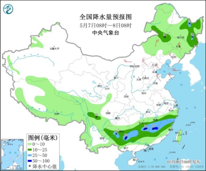 5月7日8时至8日8时,江南中南部、华南北部、贵州南部以及东北地区东北部、内蒙古东北部等地的部分地区有中到大雨,其中,湖南南部、江西南部、广西北部等地局地有暴雨(50~70毫米)。内蒙古东部、华北北部和东部、东北地区中南部、黄淮东部等地的部分地区有5~7级风。