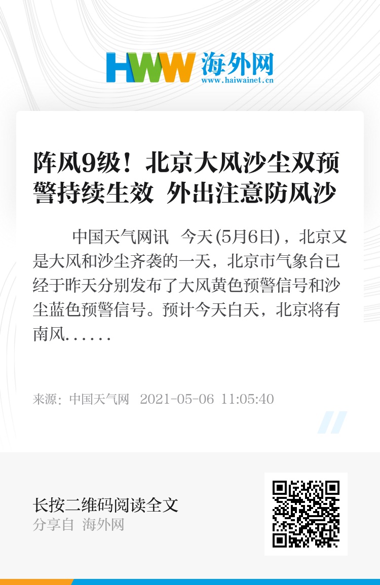 中国天气网讯 今天(5月6日),北京又是大风和沙尘齐袭的一天,北京市气象台已经于昨天分别发布了大风黄色预警信号和沙尘蓝色预警信号。预计今天白天,北京将有南风转北风5级左右,阵风可达9级,并伴有沙尘天气,公众出行需注意防范大风沙尘侵袭。