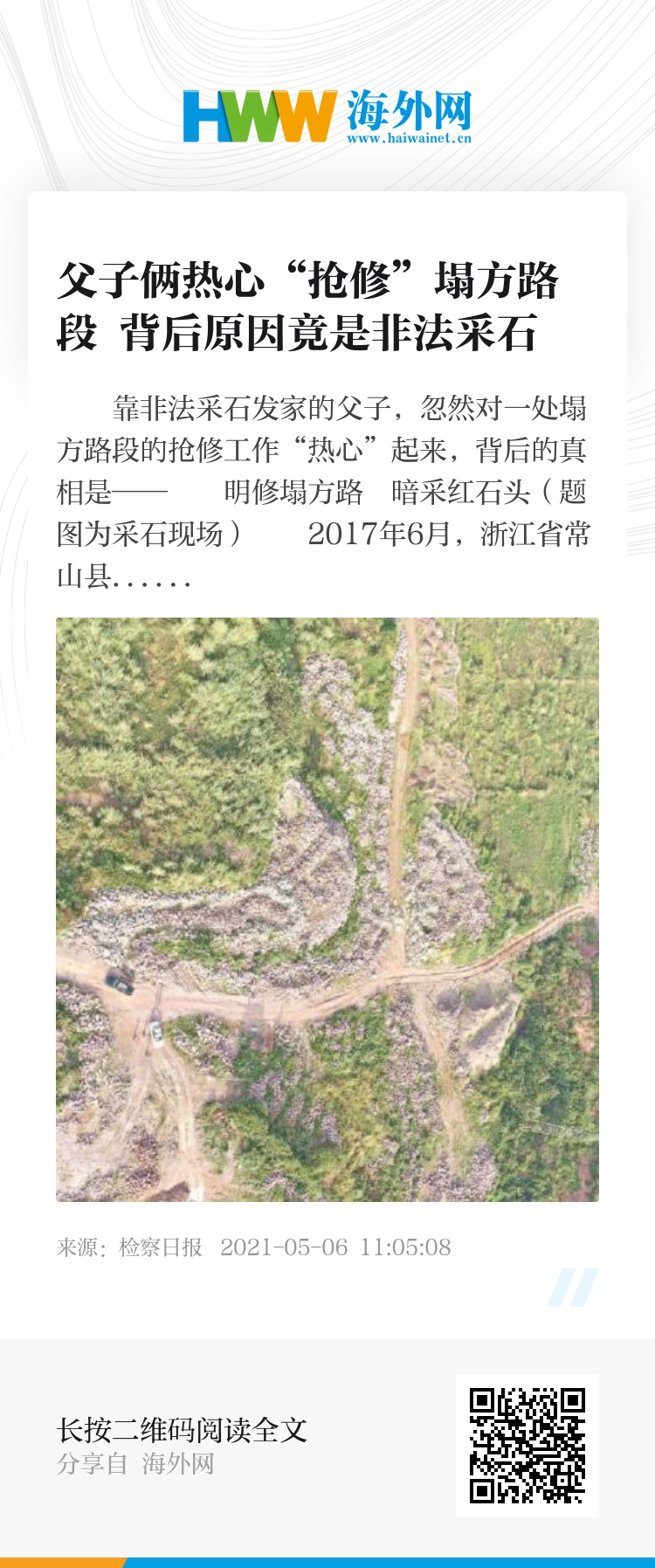 2017年6月,浙江省常山县一采石场附近的路基发生轻微塌方,当地采石场老板老童的儿子小童主动组织人员“抢修”。