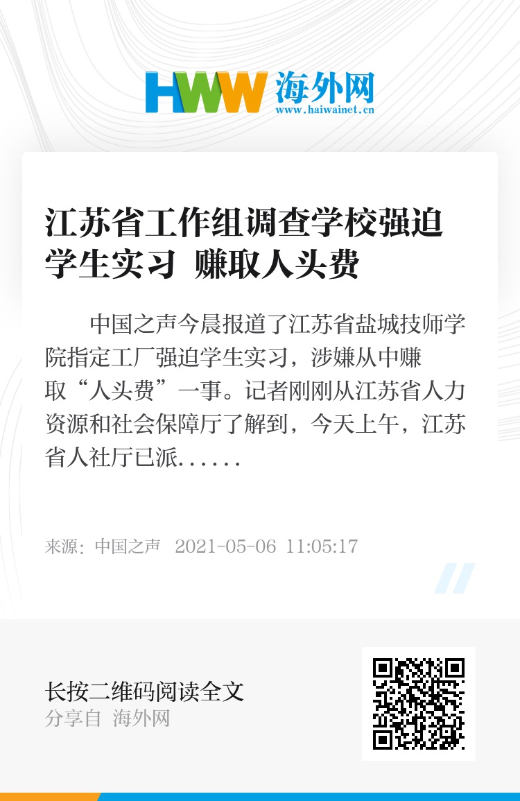 中国之声今晨报道了江苏省盐城技师学院指定工厂强迫学生实习,涉嫌从中赚取“人头费”一事。记者刚刚从江苏省人力资源和社会保障厅了解到,今天上午,江苏省人社厅已派出工作组赶赴盐城调查,如查实将严肃处理,并将及时回应社会关注。(总台央广记者管昕)