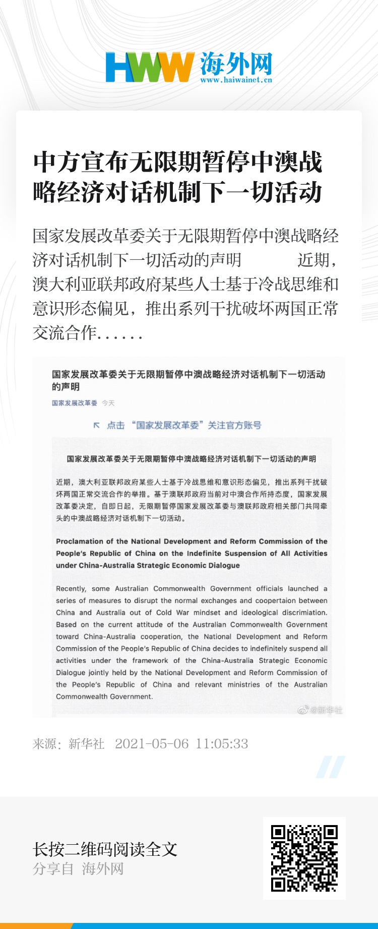 国家发展改革委关于无限期暂停中澳战略经济对话机制下一切活动的声明
