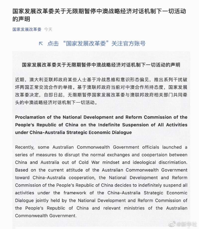 Proclamation of the National Development and Reform Commission of the People’s Republic of China on the Indefinite Suspension of All Activities under China-Australia Strategic Economic Dialogue