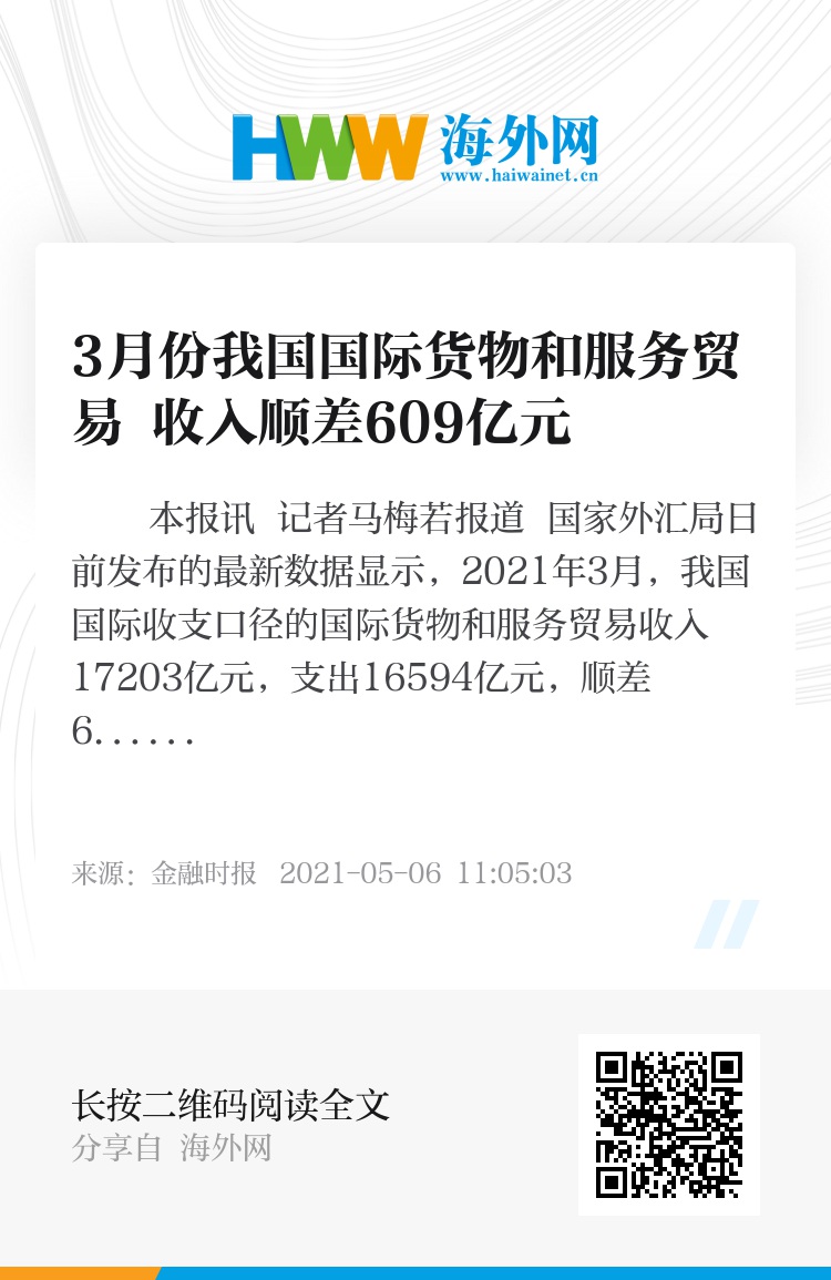 本报讯 记者马梅若报道 国家外汇局日前发布的最新数据显示,2021年3月,我国国际收支口径的国际货物和服务贸易收入17203亿元,支出16594亿元,顺差609亿元。其中,货物贸易收入15424亿元,支出14256亿元,顺差1168亿元;服务贸易收入1778亿元,支出2338亿元,逆差559亿元。