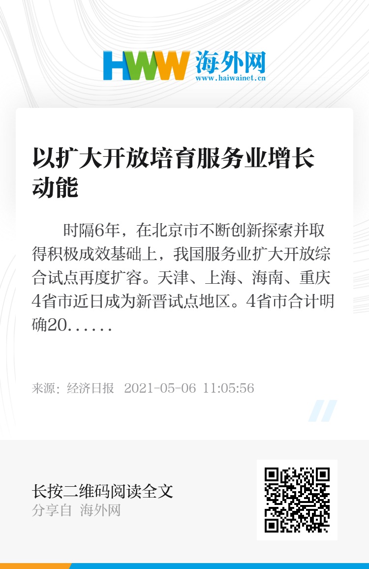 时隔6年,在北京市不断创新探索并取得积极成效基础上,我国服务业扩大开放综合试点再度扩容。天津、上海、海南、重庆4省市近日成为新晋试点地区。4省市合计明确203项试点任务,与北京市形成“1+N”的试点格局。