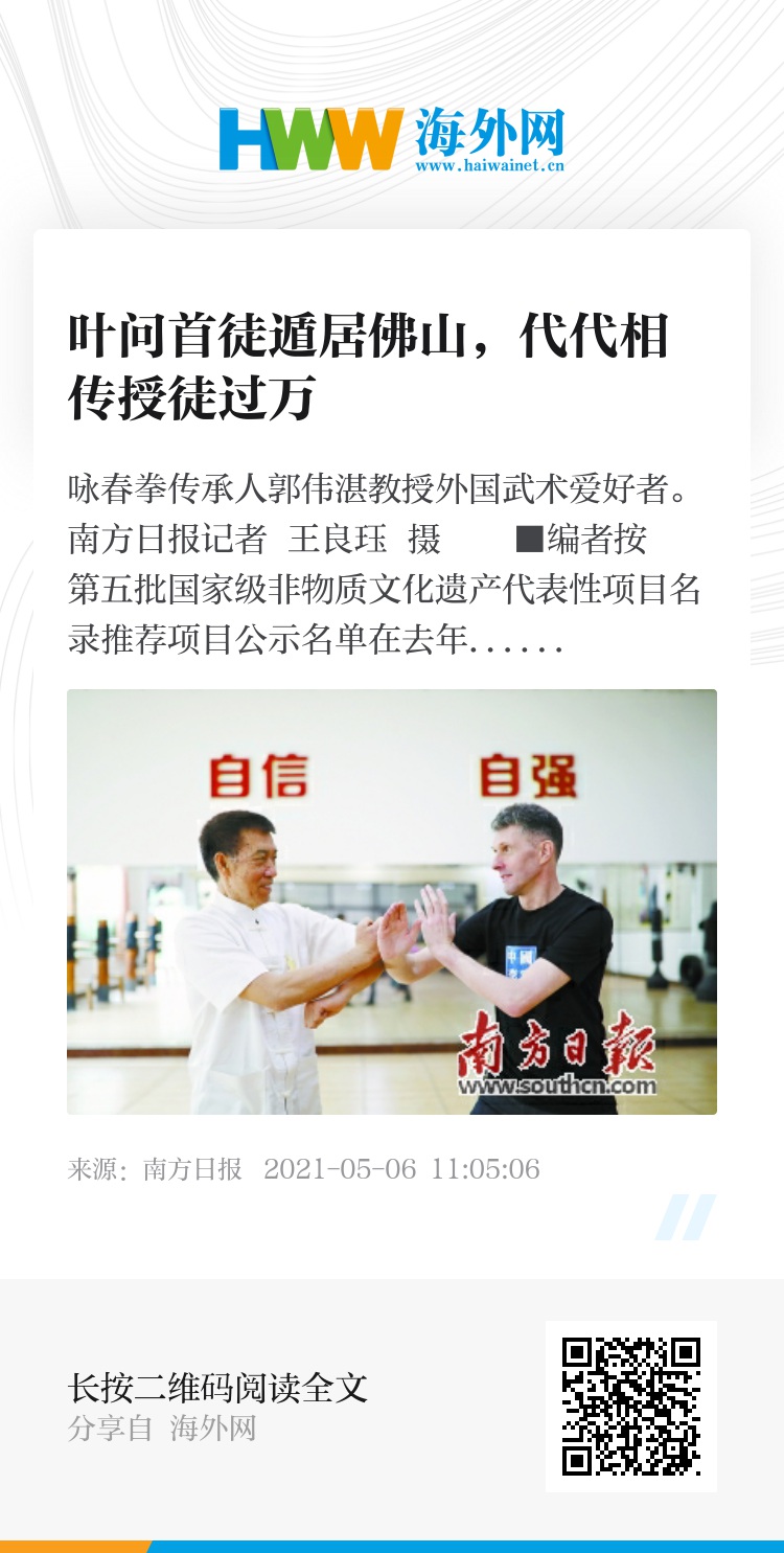 传承咏春拳几十年来,郭伟湛的弟子遍布全球,他们在阿根廷、丹麦、瑞士、新加坡等地开设了50多家武馆。这些弟子中,每年都有很多人回到佛山找他继续学艺。