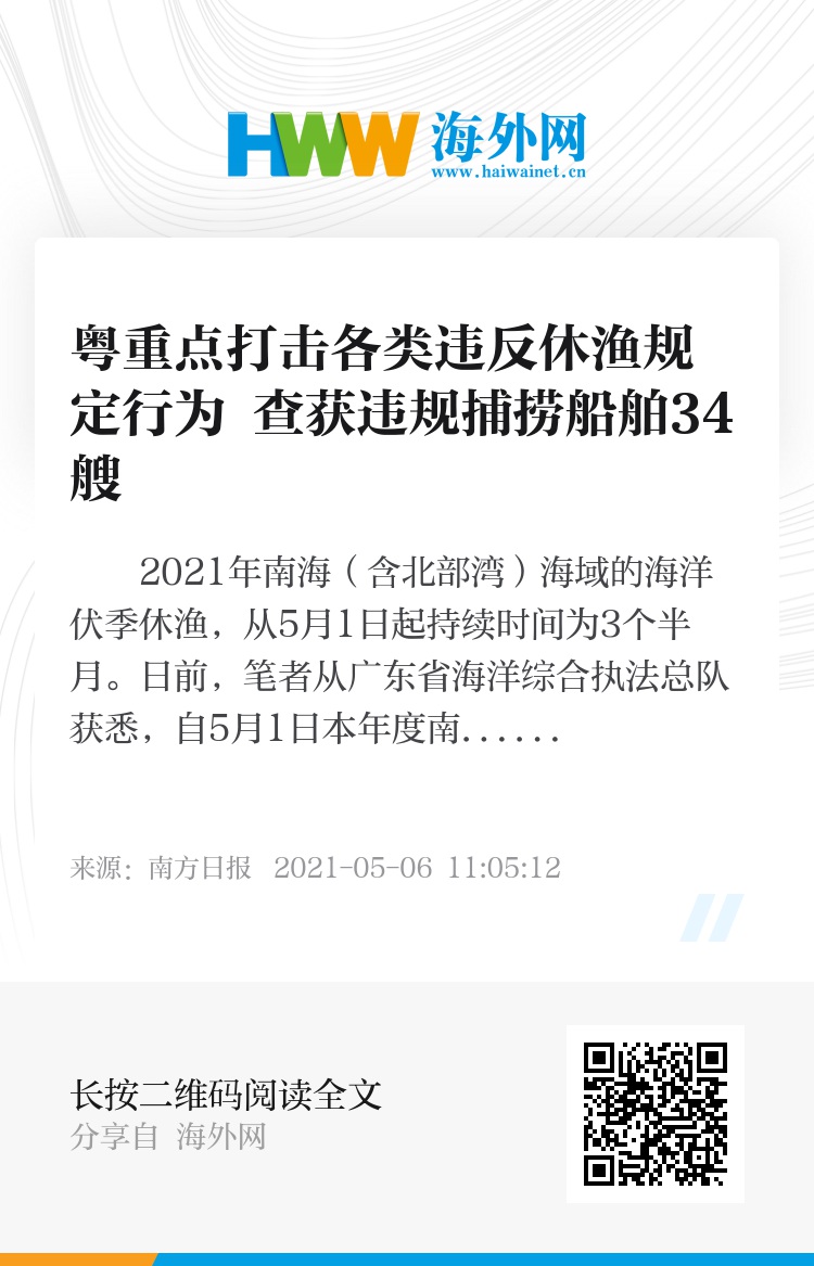 2021年南海(含北部湾)海域的海洋伏季休渔,从5月1日起持续时间为3个半月。日前,笔者从广东省海洋综合执法总队获悉,自5月1日本年度南海伏季休渔开始以来,海洋综合执法部门坚守岗位,对偷捕行为露头就打。据不完全统计,截至5月5日18时,已查处34艘违规进行渔业作业的船舶。