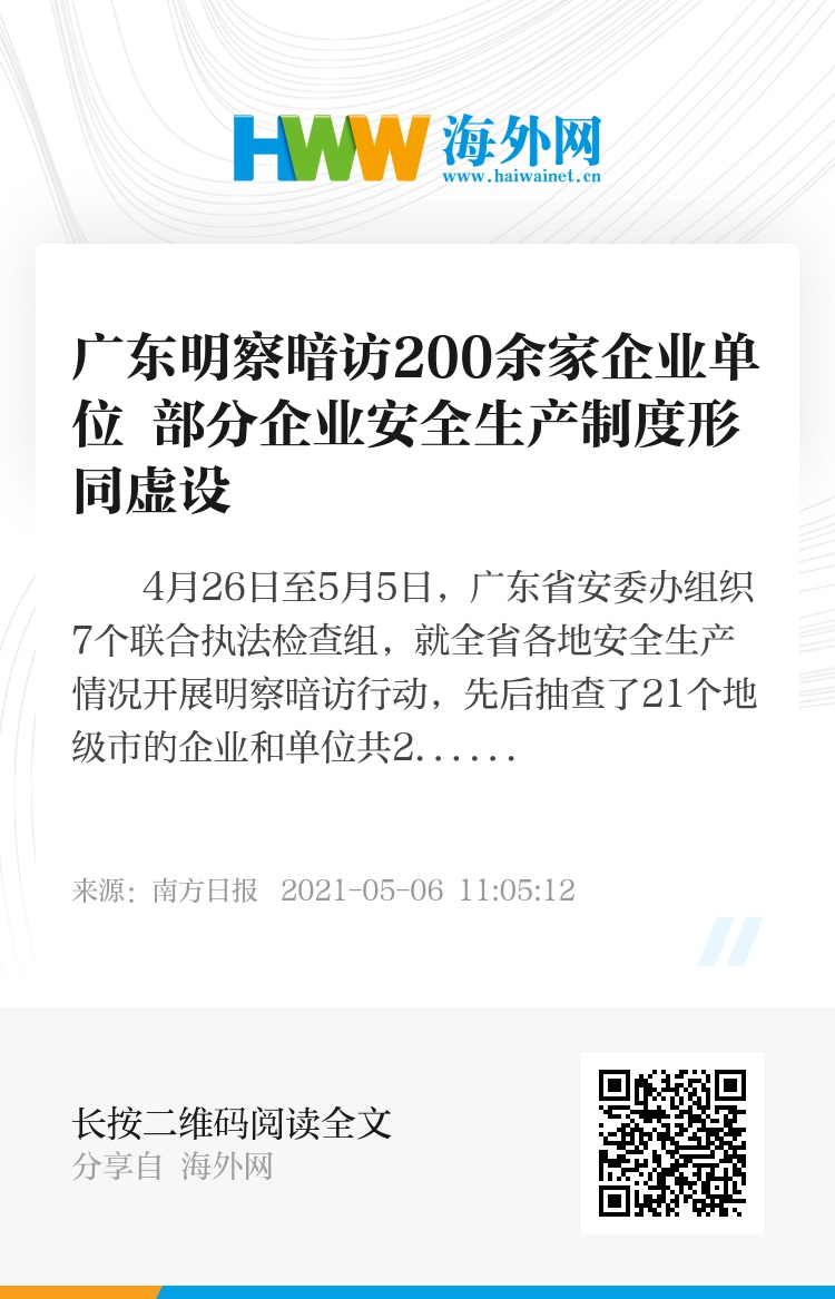 4月26日至5月5日,广东省安委办组织7个联合执法检查组,就全省各地安全生产情况开展明察暗访行动,先后抽查了21个地级市的企业和单位共225家,发现隐患问题629个;抽查政府及监管部门47家,提出建议17条,发现问题58项。在检查中发现,部分公司企业主体责任落实不到位,安全生产管理制度形同虚设。