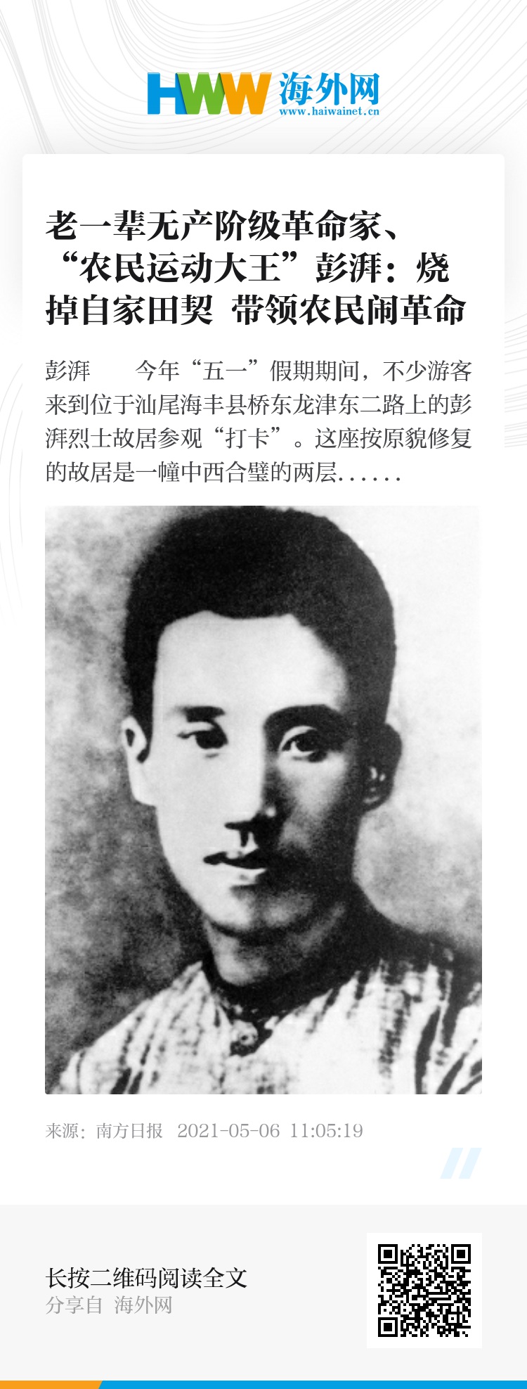 虽然家里拥有“鸦飞不过的田产”,但出身富贵的彭湃却是个“叛逆者”。他从小受新思想、新文化的熏陶,耳闻目睹贫困农民的凄惨生活,立志要改革不合理的社会、推翻不合理的制度。后来,在东渡日本求学期间,他接触并开始研读马克思的学说。