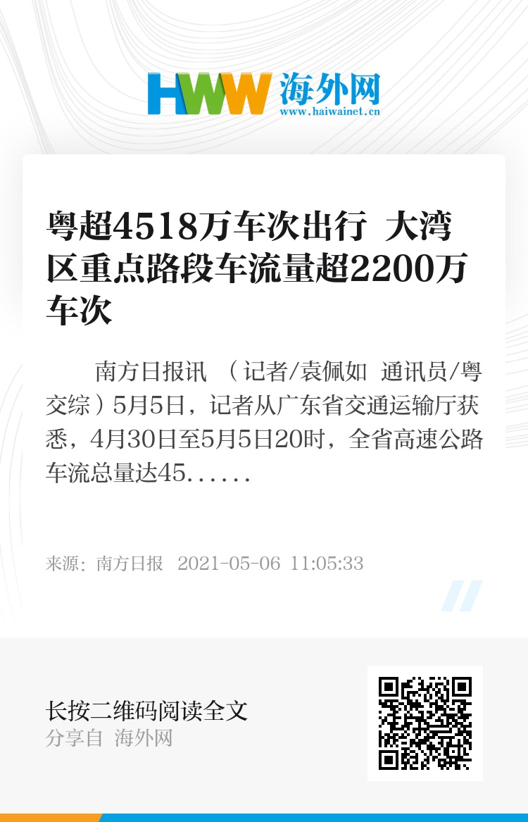 据统计,4月30日至5月5日20时,全省高速公路车流总量达4518万车次,粤港澳大湾区重点路段车流量达2203万车次。其中,5月1日车流量达到“五一”出行峰值,当日高速公路车流量达833万车次。琼州海峡旅客发送量超17.6万人次,同比上升60%