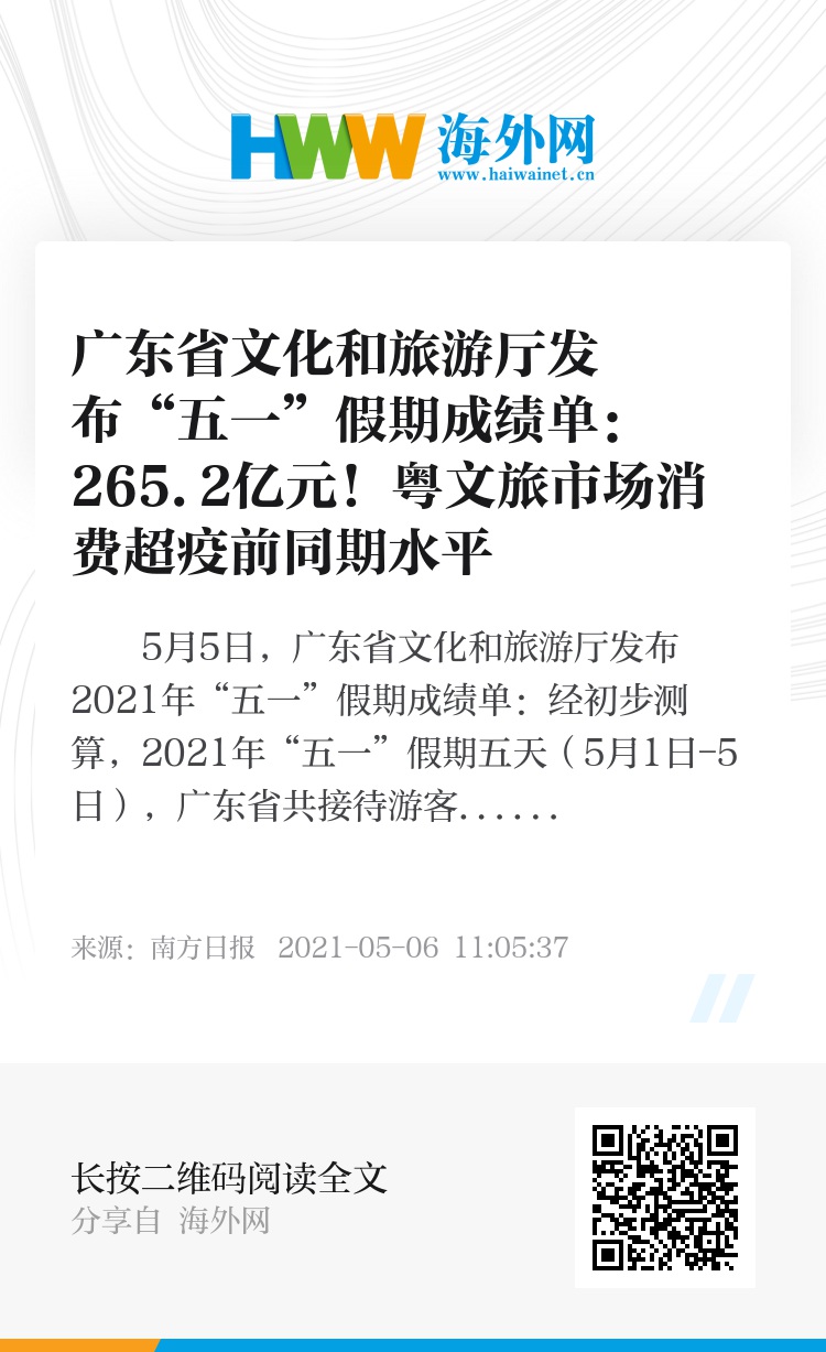 5月5日,广东省文化和旅游厅发布2021年“五一”假期成绩单:经初步测算,2021年“五一”假期五天(5月1日-5日),广东省共接待游客4278.1万人次,同比增长129.8%,较2019年同期增长11.6%(按可比口径,下同),收入265.2亿元(同比增长156.0%,较2019年同期增长13.7%);纳入监测的150家重点景区共接待游客1162.1万人次,同比增长239.2%,较2019年同期增长8.6%;纳入监测的13家红色旅游经典景区共接待游客104.9万人次,同比增长176.7%,较2019年同期增长4.9%。得益于疫情防控得当,这个“五一”假期在群众出游意愿高涨的助推下,迎来了今年首个跨省游高峰,旅游业迎来规模化复苏。广东,作为全国最大的旅游客源地和目的地之一,文旅消费活力得到进一步释放。旺盛的文化和旅游消费是文旅市场繁荣的集中体现,亦是文化和旅游产业高质量发展的重要基础。从这个“五一”假期,记者观察到了助推广东文化和旅游业高质量发展的市场动力。