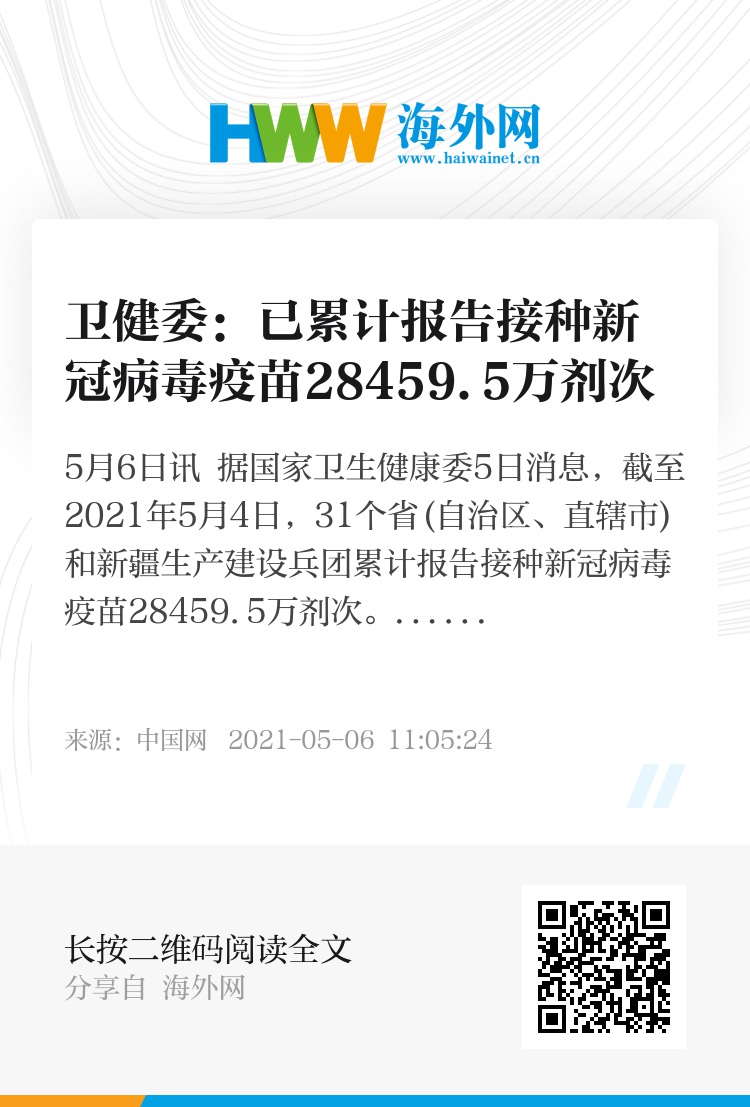 中国网5月6日讯 据国家卫生健康委5日消息,截至2021年5月4日,31个省(自治区、直辖市)和新疆生产建设兵团累计报告接种新冠病毒疫苗28459.5万剂次。