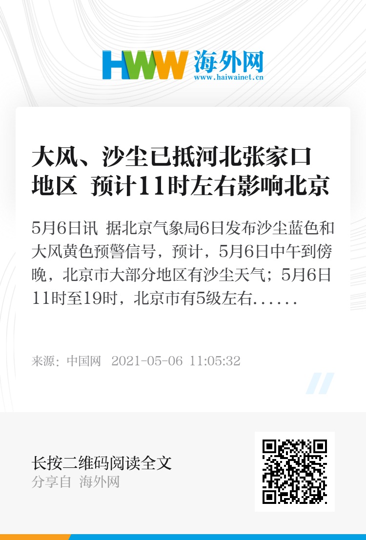 中国网5月6日讯 据北京气象局6日发布沙尘蓝色和大风黄色预警信号,预计,5月6日中午到傍晚,北京市大部分地区有沙尘天气;5月6日11时至19时,北京市有5级左右偏北风,阵风8、9级;6日夜间至7日白天,有4、5级偏北风,阵风7级左右。
