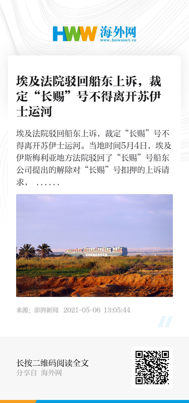 当地时间5月4日,埃及伊斯梅利亚地方法院驳回了“长赐”号船东公司提出的解除对“长赐”号扣押的上诉请求, 裁定其不得离开苏伊士运河。