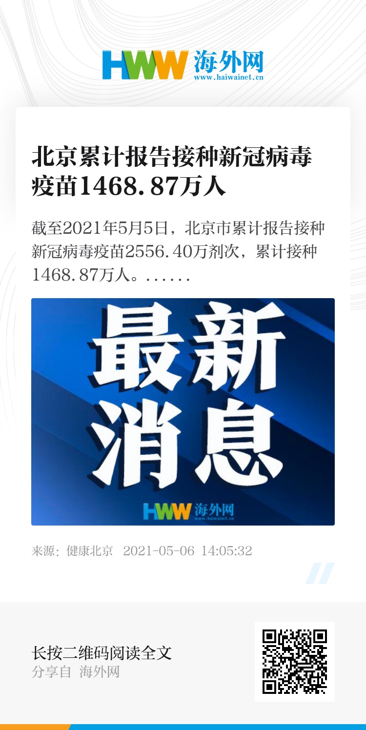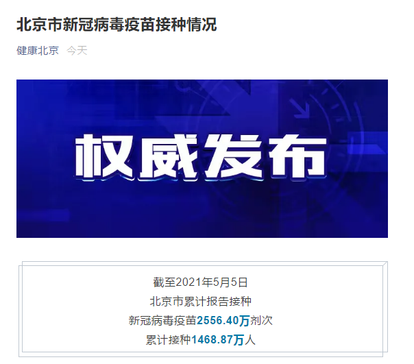 截至2021年5月5日,北京市累计报告接种新冠病毒疫苗2556.40万剂次,累计接种1468.87万人。