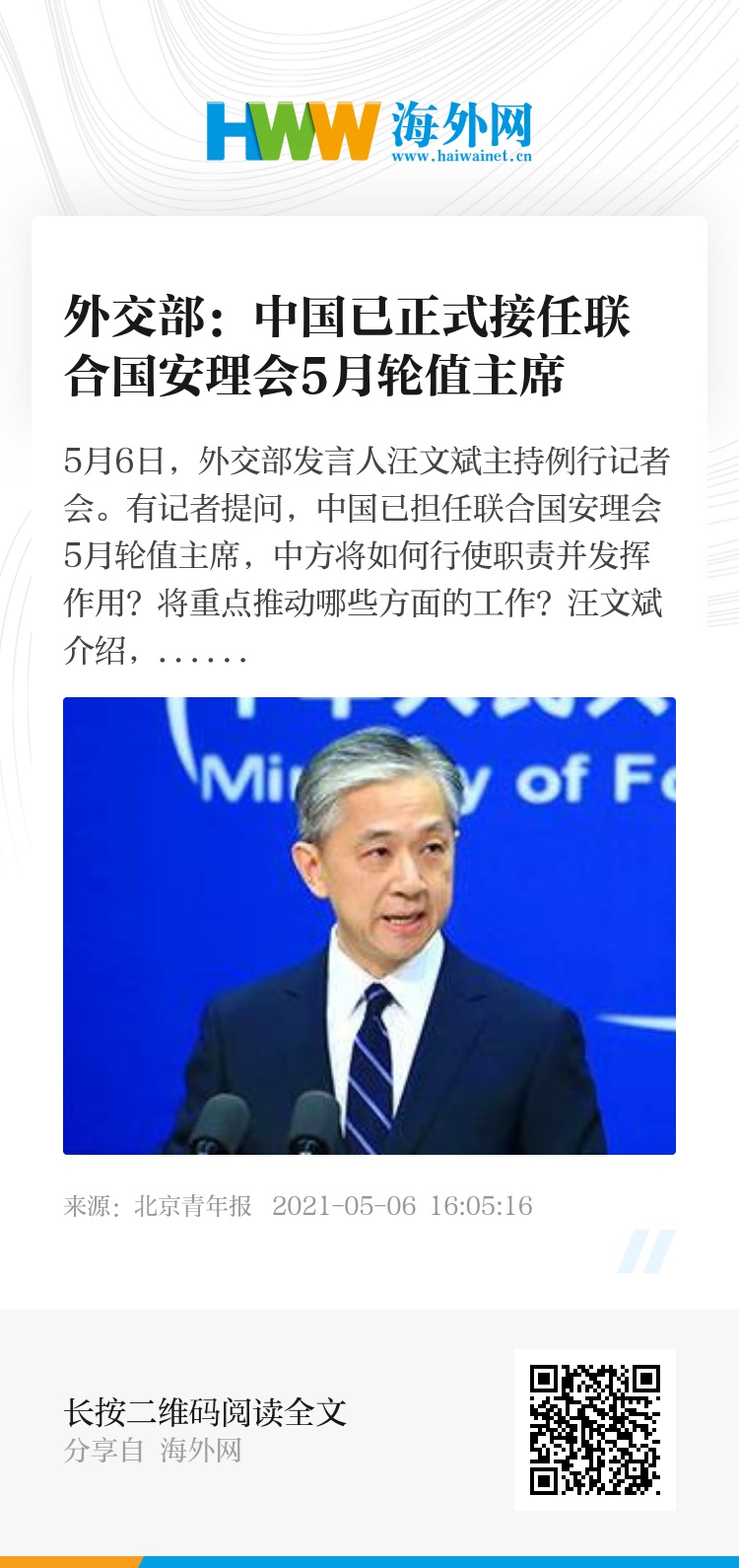 汪文斌介绍,中国已正式接任联合国安理会5月轮值主席。安理会5月将审议中东、叙利亚、也门、伊拉克、利比亚、索马里、萨赫勒、朝鲜、波黑等地区热点问题。