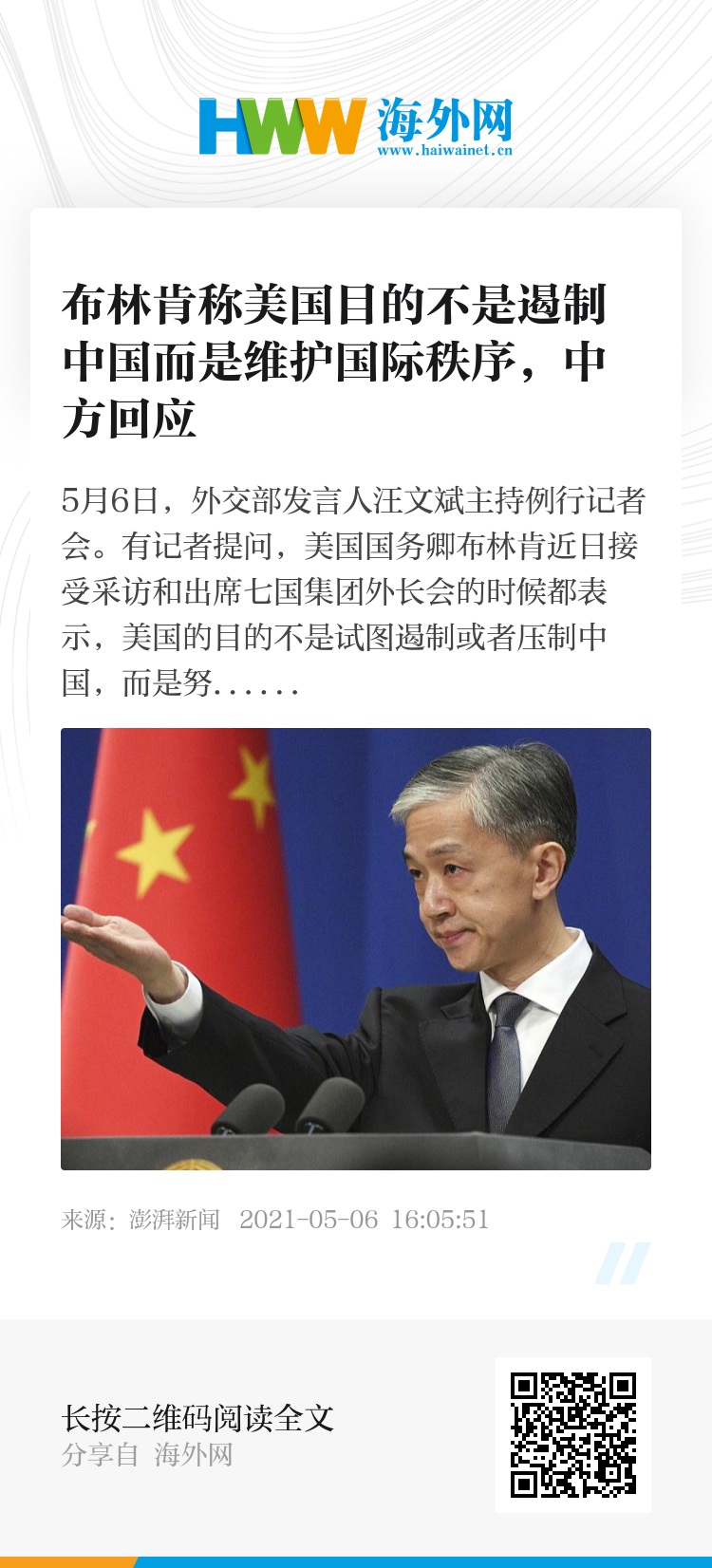 5月6日,外交部发言人汪文斌主持例行记者会。有记者提问,美国国务卿布林肯近日接受采访和出席七国集团外长会的时候都表示,美国的目的不是试图遏制或者压制中国,而是努力维护以规则为基础的国际秩序,当任何国家挑战这种基于规则的秩序的时候,美国都会捍卫秩序,请问中方有何评论?