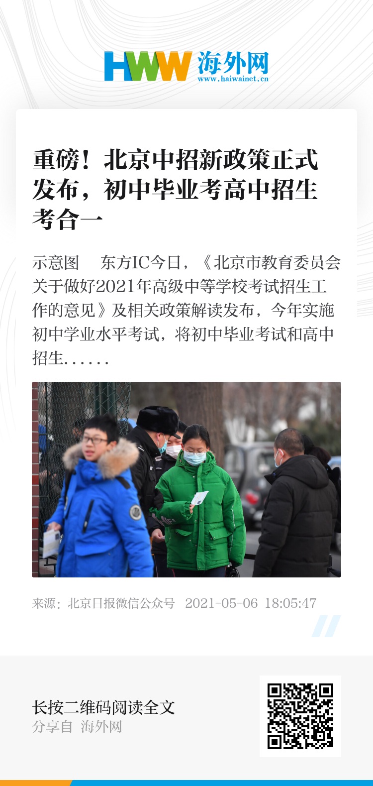 根据《北京市教育委员会关于印发<北京市初中学业水平考试实施办法>的通知》(京教基二〔2020〕2号)要求,2021年实施初中学业水平考试制度,将初中毕业考试和高中招生考试“两考合一”。