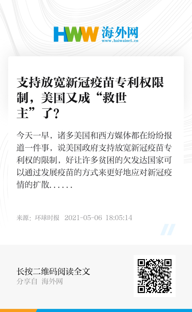 今天一早,诸多美国和西方媒体都在纷纷报道一件事,说美国政府支持放宽新冠疫苗专利权的限制,好让许多贫困的欠发达国家可以通过发展疫苗的方式来更好地应对新冠疫情的扩散。