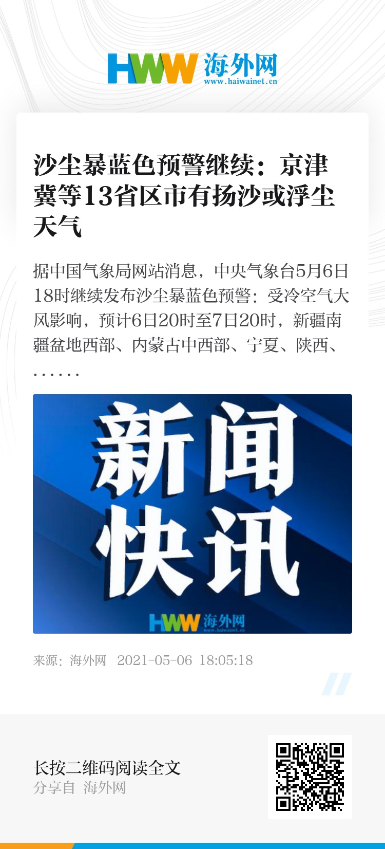 据中国气象局网站消息,中央气象台5月6日18时继续发布沙尘暴蓝色预警: