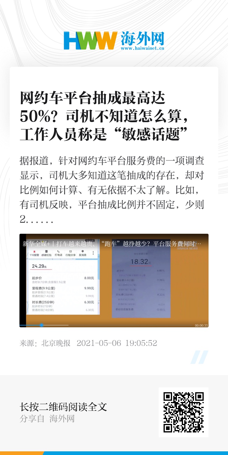 据新华社报道,针对网约车平台服务费的一项调查显示,司机大多知道这笔抽成的存在,却对比例如何计算、有无依据不太了解。比如,有司机反映,平台抽成比例并不固定,少则20%-25%,有时是约35%,最高甚至达到50%。对此,某网约车平台工作人员表示,平台服务费属于敏感话题,即使自己“心里可能有答案”,但是“不确定也不敢回答”。