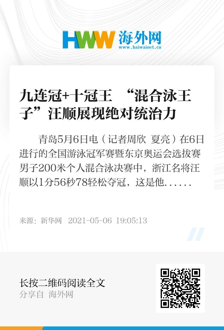 新华社青岛5月6日电(记者周欣 夏亮)在6日进行的全国游泳冠军赛暨东京奥运会选拔赛男子200米个人混合泳决赛中,浙江名将汪顺以1分56秒78轻松夺冠,这是他自2011年以来第10次获得该项冠军,并实现九连冠,展现出绝对统治力。