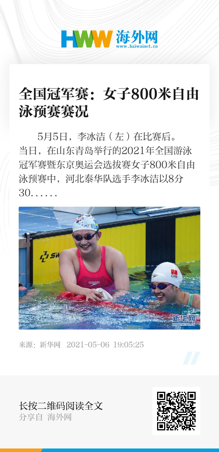 当日,在山东青岛举行的2021年全国游泳冠军赛暨东京奥运会选拔赛女子800米自由泳预赛中,河北泰华队选手李冰洁以8分30秒56的成绩位列第一,晋级决赛。