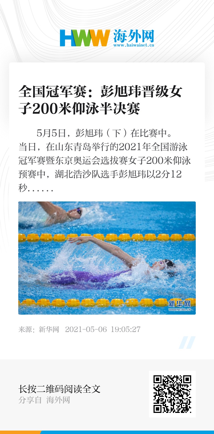 当日,在山东青岛举行的2021年全国游泳冠军赛暨东京奥运会选拔赛女子200米仰泳预赛中,湖北浩沙队选手彭旭玮以2分12秒37的成绩位列第一,晋级半决赛。