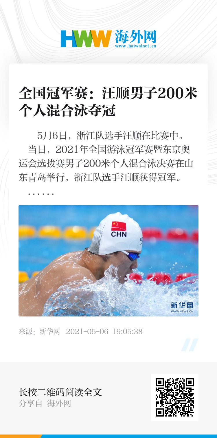 当日,2021年全国游泳冠军赛暨东京奥运会选拔赛男子200米个人混合泳决赛在山东青岛举行,浙江队选手汪顺获得冠军。