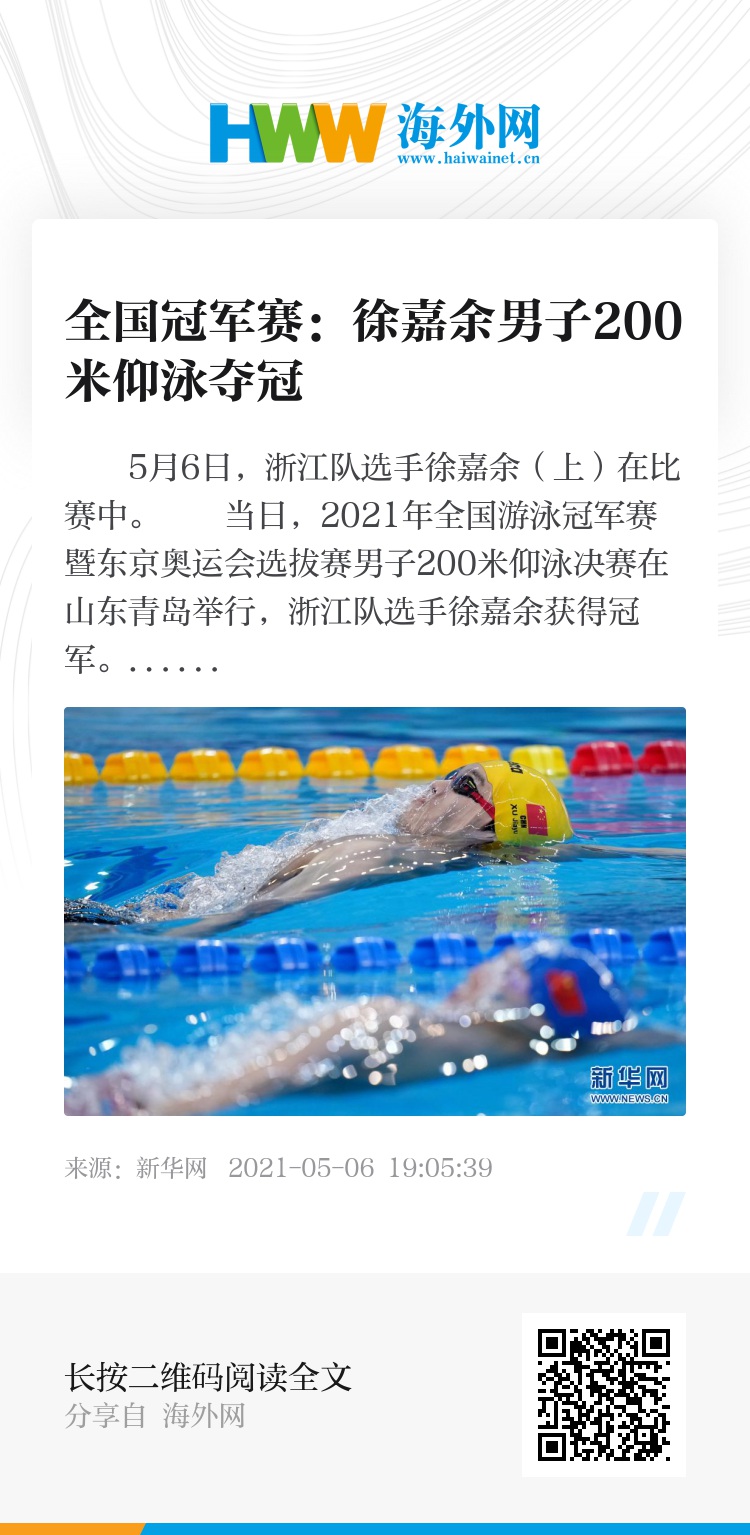 当日,2021年全国游泳冠军赛暨东京奥运会选拔赛男子200米仰泳决赛在山东青岛举行,浙江队选手徐嘉余获得冠军。
