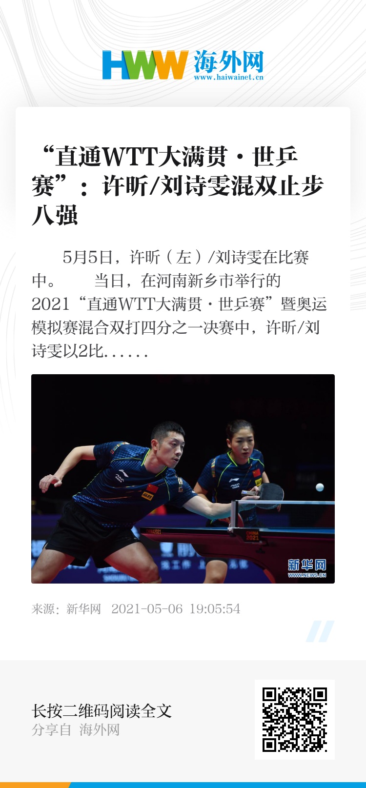 当日,在河南新乡市举行的2021“直通WTT大满贯·世乒赛”暨奥运模拟赛混合双打四分之一决赛中,许昕/刘诗雯以2比4不敌周雨/陈幸同,止步八强。